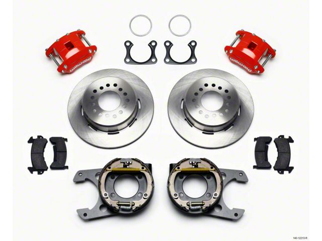 D154 Pro-Series rear disc kits provides a complete solution for popular muscle car rear axles that require a parking brake. Forged D154 dual piston calipers, 12.19" one-piece drum/rotors, and high friction pads provide optimized and balanced braking for all types of custom performance street/strip and show machines. The neatly hidden internal shoe system provides a clean installation with superior static holding power for parking. D154 rear caliper kits offer a complimentary match to vehicles using Wilwood D52 or D154 calipers on OE spindles. Optional caliper finishes and rotor designs enable the builder to personalize the style and optimize brake performance.