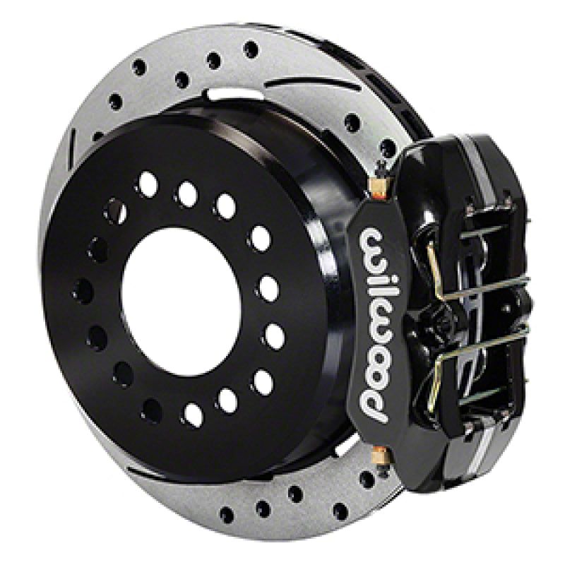 Forged Dynapro Low-Profile Pro-Series rear disc brake kits provide a complete solution for popular muscle car rear axles on applications that require a parking brake assembly and extra clearance for 14.00" to 15.00" rim applications. Forged billet Dynapro Low-Profile four-piston calipers 11.00" one-piece hat and rotor assemblies, and high friction pads provide optimized and balanced braking for all types of custom performance street/strip and show machines. The neatly hidden internal shoe system provides a clean installation with superior static holding power for parking. Optional caliper finishes and rotor designs enable the builder to personalize the style and optimize brake performance for every individual application.