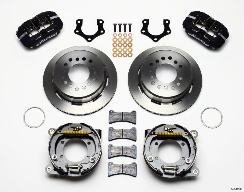 Forged Dynapro Low-Profile Pro-Series rear disc brake kits provide a complete solution for popular muscle car rear axles on applications that require a parking brake assembly and extra clearance for 14.00" to 15.00" rim applications. Forged billet Dynapro Low-Profile four-piston calipers 11.00" one-piece hat and rotor assemblies, and high friction pads provide optimized and balanced braking for all types of custom performance street/strip and show machines. The neatly hidden internal shoe system provides a clean installation with superior static holding power for parking. Optional caliper finishes and rotor designs enable the builder to personalize the style and optimize brake performance for every individual application.