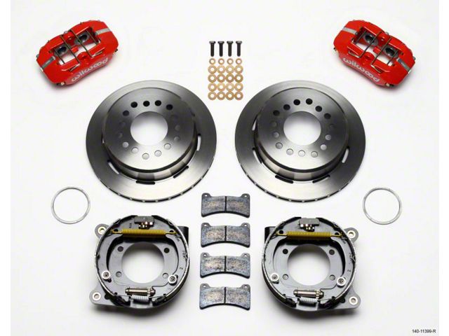 Forged Dynapro Low-Profile Pro-Series rear disc brake kits provide a complete solution for popular muscle car rear axles on applications that require a parking brake assembly and extra clearance for 14.00" to 15.00" rim applications. Forged billet Dynapro Low-Profile four-piston calipers 11.00" one-piece hat and rotor assemblies, and high friction pads provide optimized and balanced braking for all types of custom performance street/strip and show machines. The neatly hidden internal shoe system provides a clean installation with superior static holding power for parking. Optional caliper finishes and rotor designs enable the builder to personalize the style and optimize brake performance for every individual application.