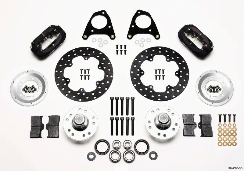 FDL Front Drag kits are drag racings most popular front brake kits. FDL kits are available for the popular muscle car spindles and select aftermarket front struts used on four-wheel disc cars weighing up to 2,800 pounds, or rear drum brake equipped cars weighing up to 2,400 pounds. Forged billet FDL four piston calipers mount directly to the spindle with a bolt-on bracket. Forged billet, five lug hubs with direct mount steel rotors combine to provide an average weight savings of over 30 pounds compared to stock drum or disc brakes. Kits include all new hardware, wheel bearings, seals and extra length lug studs.