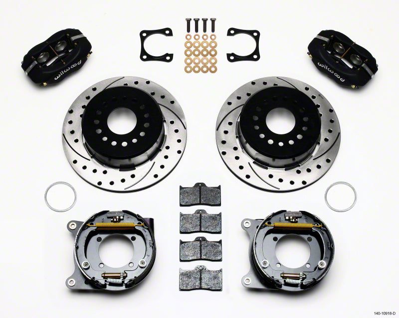 This group of FDL Pro-Series rear disc kits provides a complete solution for popular muscle car rear axles that require a parking brake. Forged billet Dynalite four piston calipers, 12.19" one-piece drum/rotors, and high friction pads provide optimized and balanced braking for all types of custom performance street/strip and show machines. The neatly hidden internal shoe system provides a clean installation with superior static holding power for parking. Optional caliper finishes and rotor designs enable the builder to personalize the style and optimize brake performance for every individual application.