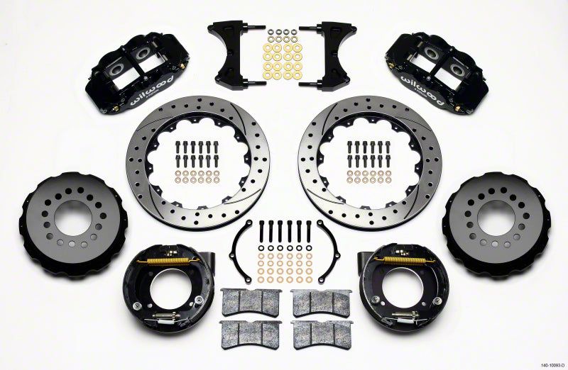 Forged Narrow Superlite 4R rear disc kits provide the ultimate Big Brake solution for popular muscle car rear axles that require a parking brake. FNSL4R four piston calipers, 13" or 14" two-piece rotors, and high performance BP-10 compound pads provide optimized and balanced braking to compliment front big brake upgrades on all types of custom, show and high performance street machines. The neatly hidden internal shoe system provides a clean installation with superior static holding power for parking. Optional caliper finishes and rotor designs allow builders to personalize the style and performance for every application.