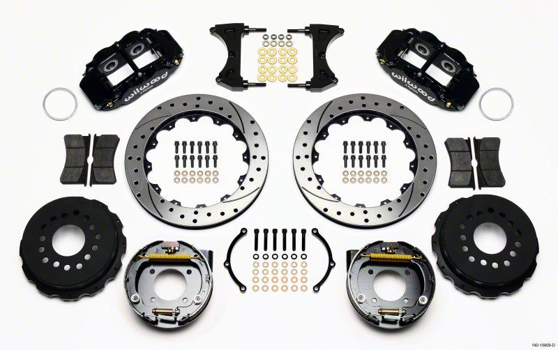 Forged Narrow Superlite 4R rear disc kits provide the ultimate Big Brake solution for popular muscle car rear axles that require a parking brake. FNSL4R four piston calipers, 13" or 14" two-piece rotors, and high performance BP-10 compound pads provide optimized and balanced braking to compliment front big brake upgrades on all types of custom, show and high performance street machines. The neatly hidden internal shoe system provides a clean installation with superior static holding power for parking. Optional caliper finishes and rotor designs allow builders to personalize the style and performance for every application.