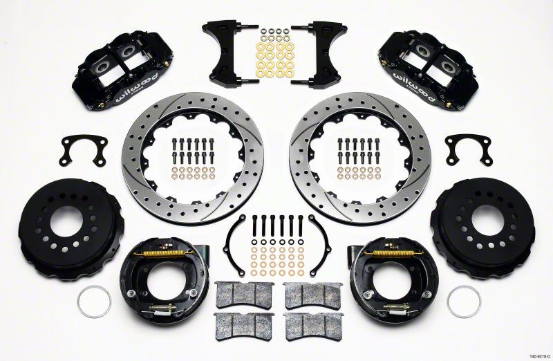 Forged Narrow Superlite 4R rear disc kits provide the ultimate Big Brake solution for popular muscle car rear axles that require a parking brake. FNSL4R four piston calipers, 13" or 14" two-piece rotors, and high performance BP-10 compound pads provide optimized and balanced braking to compliment front big brake upgrades on all types of custom, show and high performance street machines. The neatly hidden internal shoe system provides a clean installation with superior static holding power for parking. Optional caliper finishes and rotor designs allow builders to personalize the style and performance for every application.