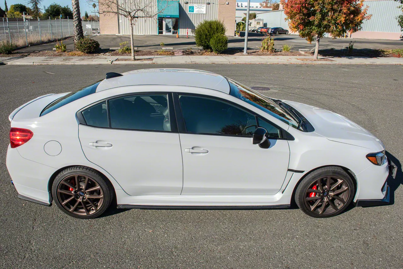 The material of the side skirts rocker panels is either carbon fiber or polyurethane P.U. The carbon fiber material is lightweight and durable, while the polyurethane material is more flexible and offers impact resistance. The WRX/STi side skirts rocker panels are designed to improve the aerodynamics of the vehicle and add a sporty and aggressive look to the car. They help to redirect air flow around the vehicle, which improves stability and handling at high speeds.