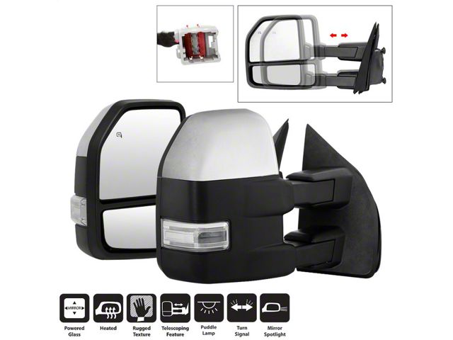 Enhance your Ford F-150's functionality and style with these xTune Power Heated LED Signal Telescoping Mirrors. These mirrors are designed to improve visibility and safety while adding a sleek, modern look to your truck. The clear LED signal lights provide better visibility to other drivers, increasing overall road safety.